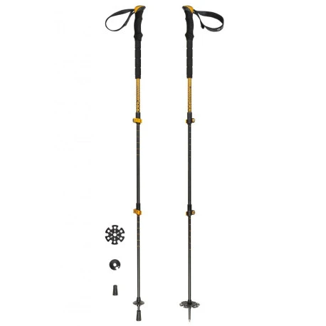 Materiale delle tre sezioni: lega di alluminio 7075. Diametro delle tre sezioni: 16/14/12 mm. Leva Lock&Go in alluminio. Manopola anatomica ed antiscivolo. Punta in tungsteno. Due rotelle incluse: invernale e da trekking. Puntale silenzioso.