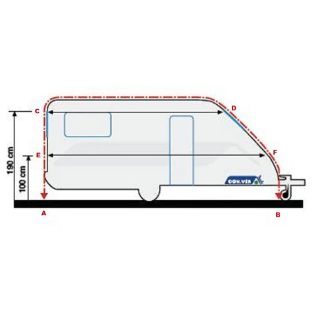 Per conoscere la taglia corretta per la tua roulotte è sufficiente misurare il perimetro A-B (da terra a terra) assicurandosi di avere la caravan parcheggiata su terreno piano: in alcuni casi possono essere necessarie le misure C-D (interasse ad 1,90m di altezza da terra) ed E-F (interasse ad 1,00m di altezza da terra), ma non preoccuparti, ordina in serenità e ti chiameremo noi per discutere tutti i dettagli necessari!